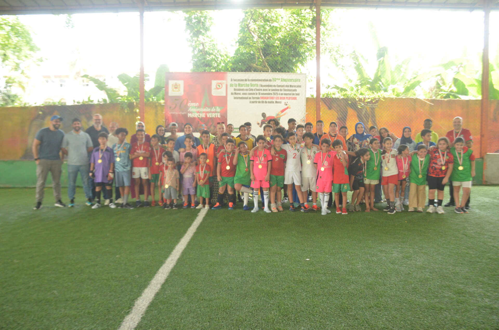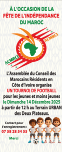 À l’occasion de la Fête de l’Indépendance du Royaume du Maroc, l’Assemblée du Conseil des Marocains Résidents en Côte d’Ivoire (#ACMRCI) a organisé, le dimanche 14 décembre 2025 à partir de 12h, au terrain URBAN des II Plateaux, un tournoi de football réunissant les jeunes et les moins jeunes.