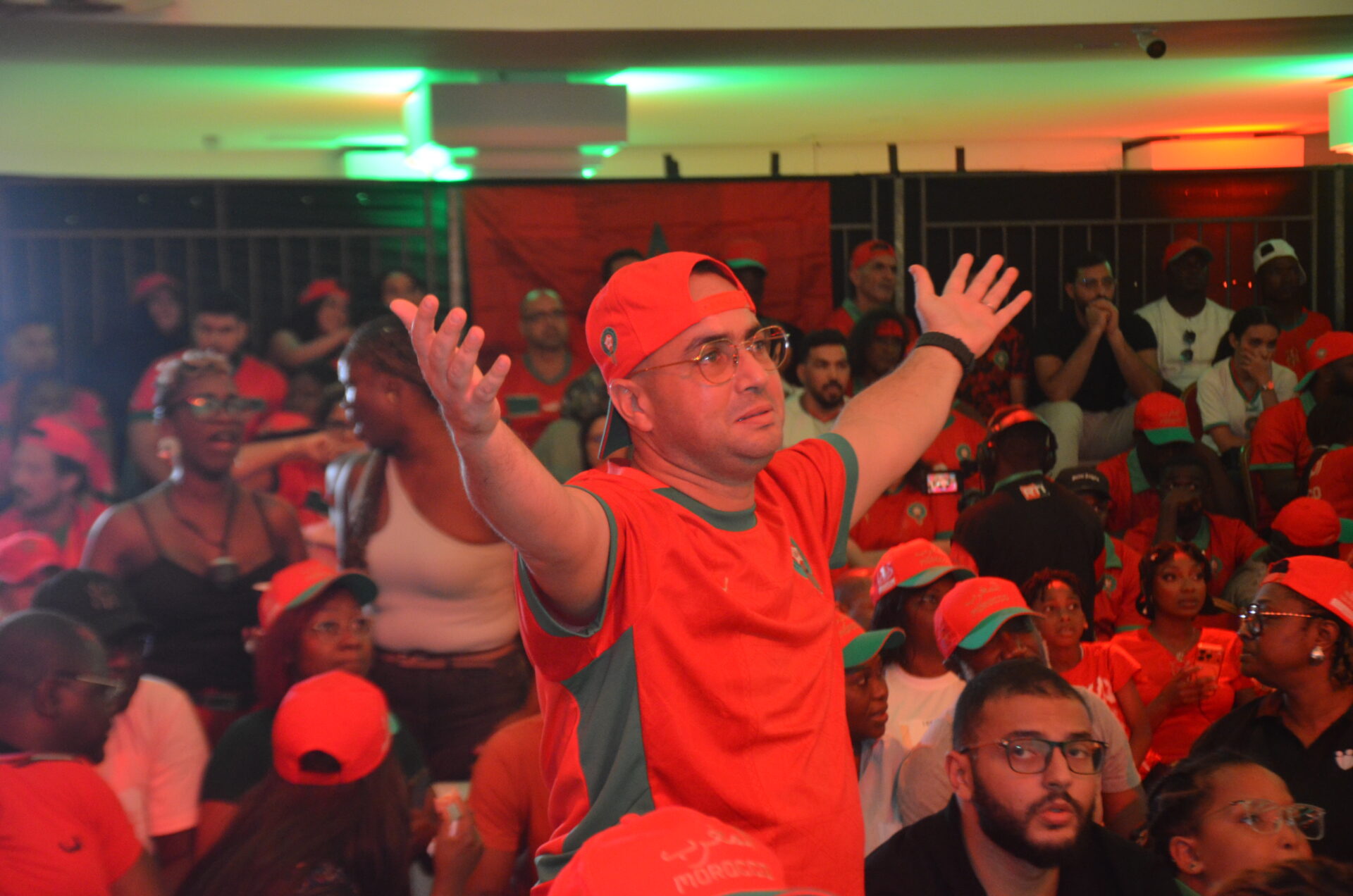 L’Espace Jeckad, à Abidjan, s’est transformé en un véritable stade marocain pour l’événement, accueillant la communauté marocaine ainsi que des supporters ivoiriens, montrant un rassemblement au-delà du sport.